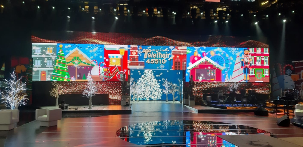 La fornitura di mq. 100,00 di passo 3.9, mq. 60,00 di passo 3,9 curvabile e mq. 30,00 di ledwall trasparent, e in aggiunta l’installazione della regia grafica per la gestione dei contributi e di tutti gli apparati video.
